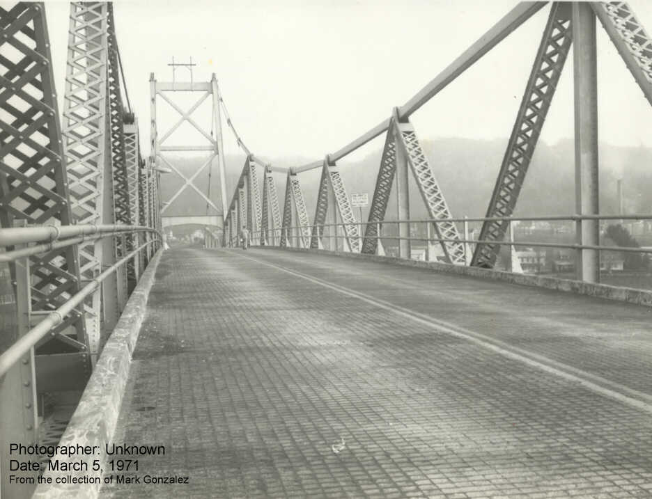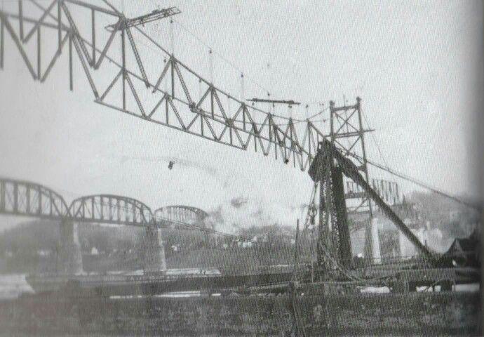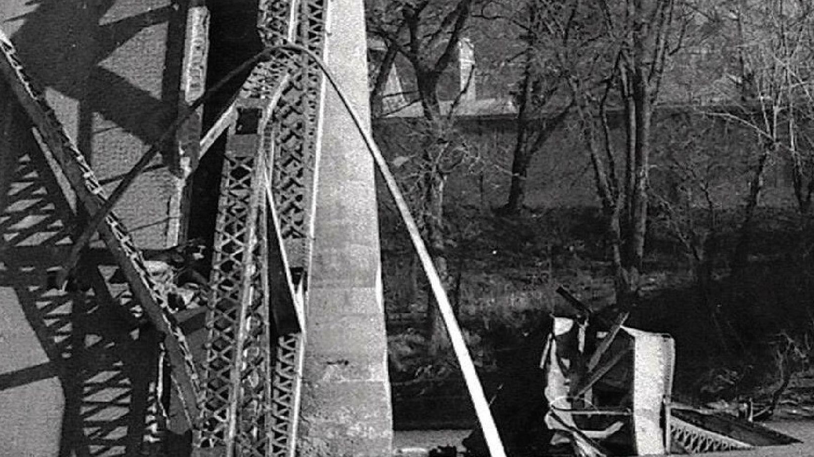 An image rarely seen. What could so uniformly detach the entirely of the road-deck and steel girder substructure, almost like a zipper undone with an energy weapon. An inverse possibility: This image was during original construction.