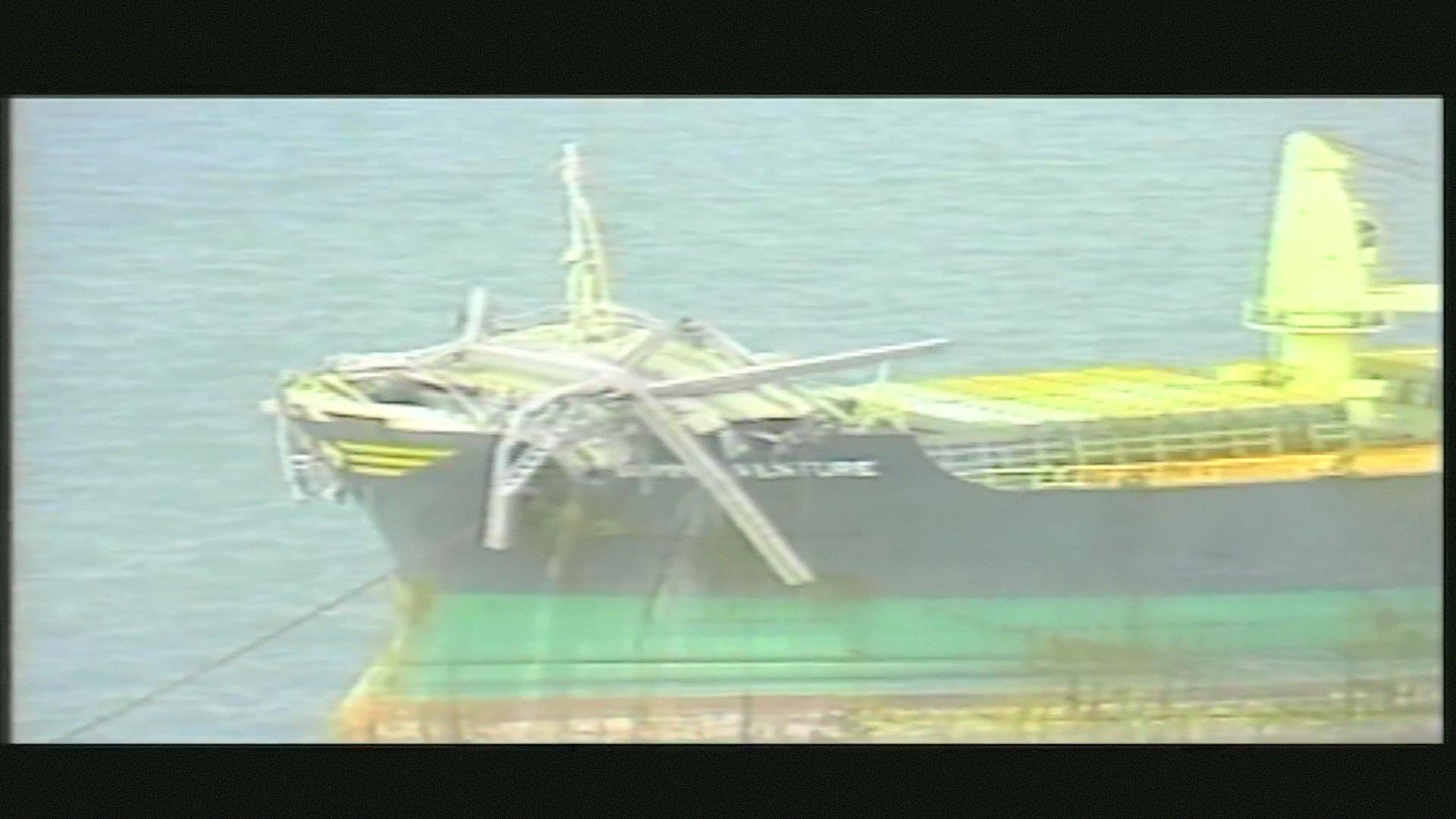 Structural steel was molten and/or jellified via DEW applying HUTCHISON EFFECT; steel hull was gashed impossibly. This was a precursor attack to the DALI / Baltimore FSK Bridge.